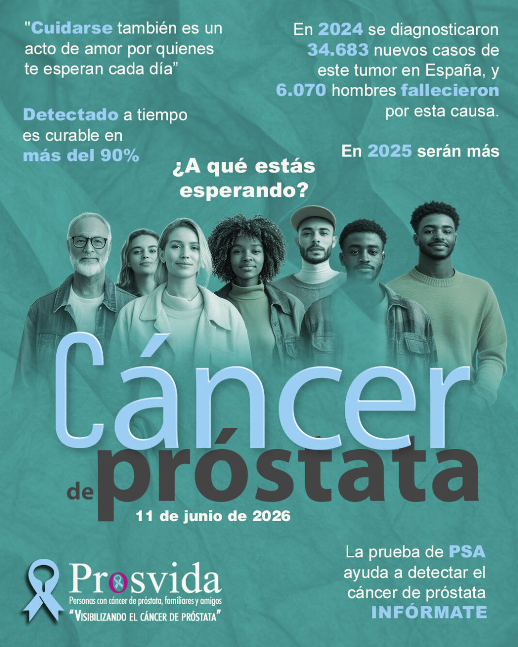 En inicio son siete los carteles que se han diseñado para la campaña, “uno por cada mes que falta para la celebración del Día Mundial del Cáncer de Próstata, el 11 de junio de 2026”. Todos ellos con el fondo verde que símbolo de la esperanza y el azul celeste simboliza la lucha contra este cáncer.