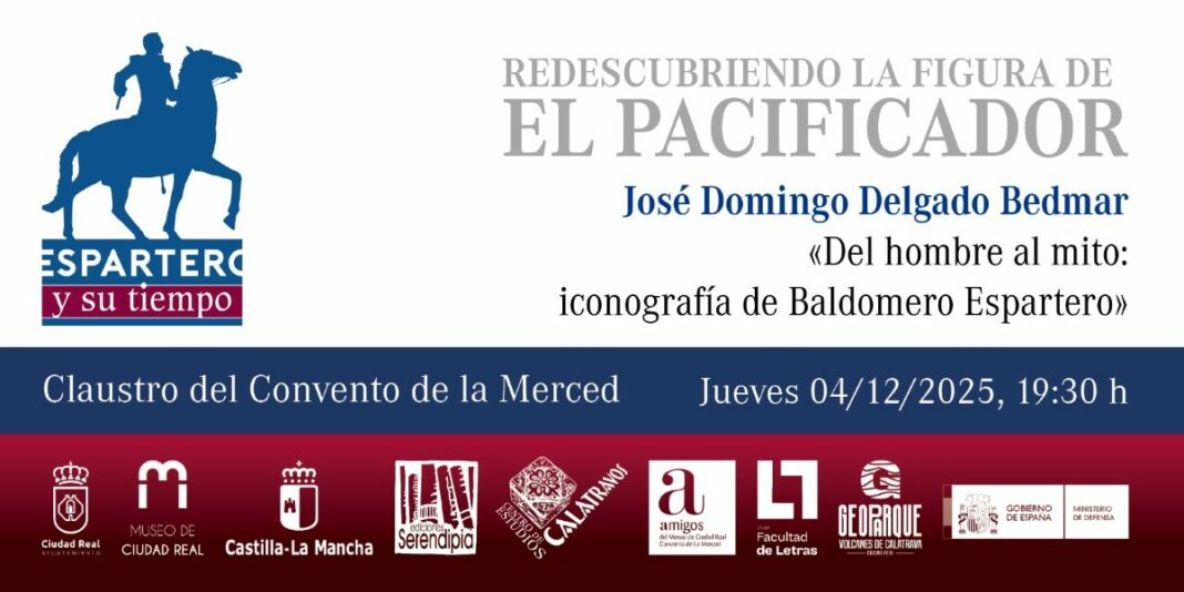 Avanzamos en el descubrimiento de la figura de El Pacificador. Próxima cita, 4 de diciembre de 2025, jueves, 19.30 horas en el claustro del antiguo Convento de la Merced (Museo de Ciudad Real). Decimos que nuestra cultura es la cultura de la imagen, refiriéndonos al momento actual; en realidad llevamos más de 2.000 años construyendo «culturas» basadas en la imagen. El doctor Delgado Bedmar desarrollará en su conferencia el enorme conjunto de representaciones plásticas que se crearon a partir del mito y del hombre, a partir de Espartero, para apoyar o contrarrestar el halo que generó un militar cuyo principio de existencia se concretaba en su conocido lema: ¡Cúmplase la voluntad nacional!