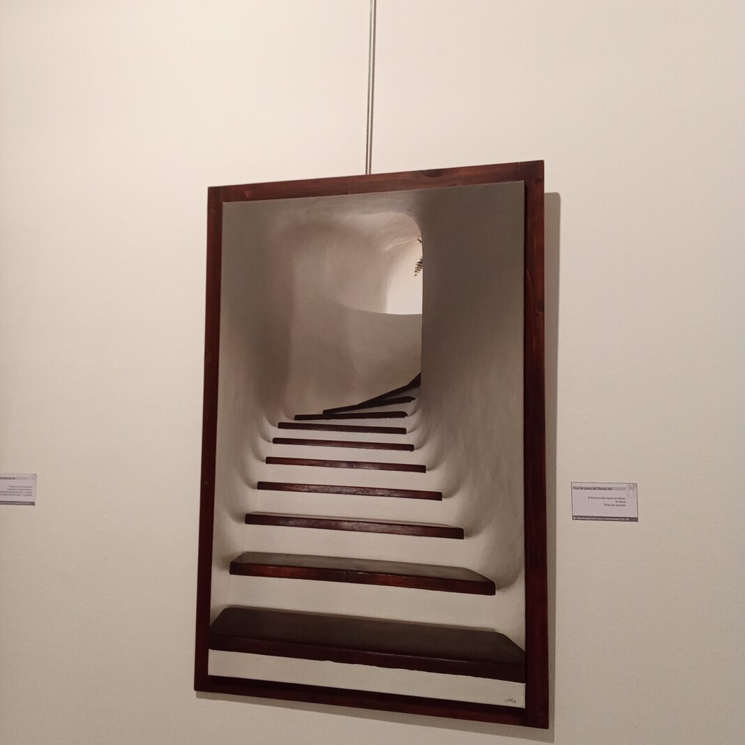 La sensorialidad aletea sobre las obras expuestas: el rumor del viento, el ámbar de la alborada, el aroma del café recién hecho, el tacto de la cal en las manos, las pisadas de un visitante inesperado, el ronroneo del gato cuando te acercas, el vértigo de esa escalera endeble que asciende frente a una espiral anublada con el mismo color de la sangre arterial. Nieves López sugiere en su catálogo que recorramos la exposición como si fuera un viaje de autodescubrimiento, con sus pausas, su escucha emocional y corporal y ese diálogo entre el espacio que habitamos y que a su vez nos habita. Y así, asesorados por la intuición, sugiero que iniciemosnuestro viaje interior por esta muestra de fotografías evocadoras, colmadas, quizá, de anhelos, sueños ypromesas que se demoran en unos espacios de ficción o tal vez reales. Espacios que esperan entre la luz y la penumbra. Espacios que vertebran, mediante peldaños mejor o peor tallados, el tiempo que vivimos.