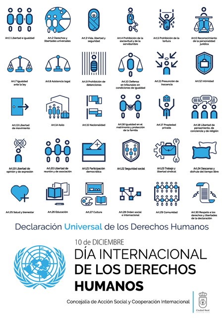 El Ayuntamiento de Ciudad Real, a través de la concejalía de Cooperación Internacional, se suma hoy a la conmemoración del Día Internacional de los Derechos Humanos, fecha que recuerda la adopción de la Declaración Universal de Derechos Humanos por la Asamblea General de Naciones Unidas y la proclamación de los derechos y libertades fundamentales que asisten a todas las personas.