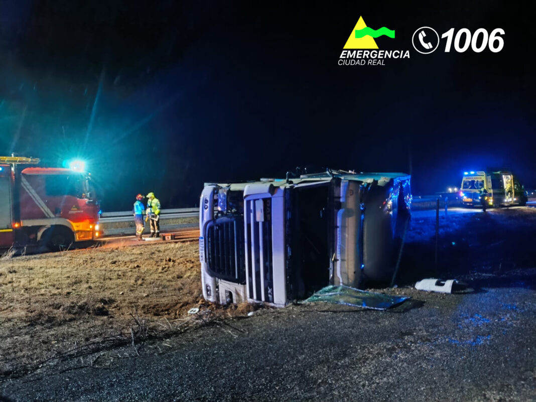 Los bomberos de Manzanares han intervenido en un accidente ocurrido en la A-4, km 180, a las 00.09 horas de este martes. Un camión articulado ha volcado provocando un derrame de combustible. Los bomberos han sacado al conductor por la luna del vehículo, han desconectado las baterías y han asegurado la zona.