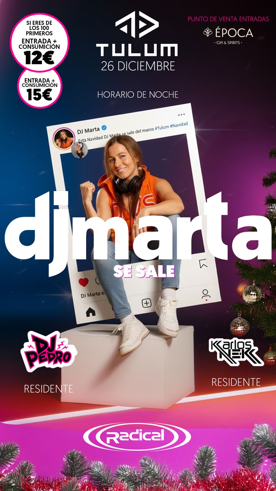 Estas son unas recientes declaraciones de DJ Marta con las que podemos hacernos una idea de que hará temblar la pista, en una sesión improvisada pero hecha a medida, donde lo más importante será el público asistente. Tiembla Puertollano y prepárate para lo mejor. Llega a la Sala Tulum DJ Marta, la reina de Radical, la diosa de las mezclas y de la música electrónica.