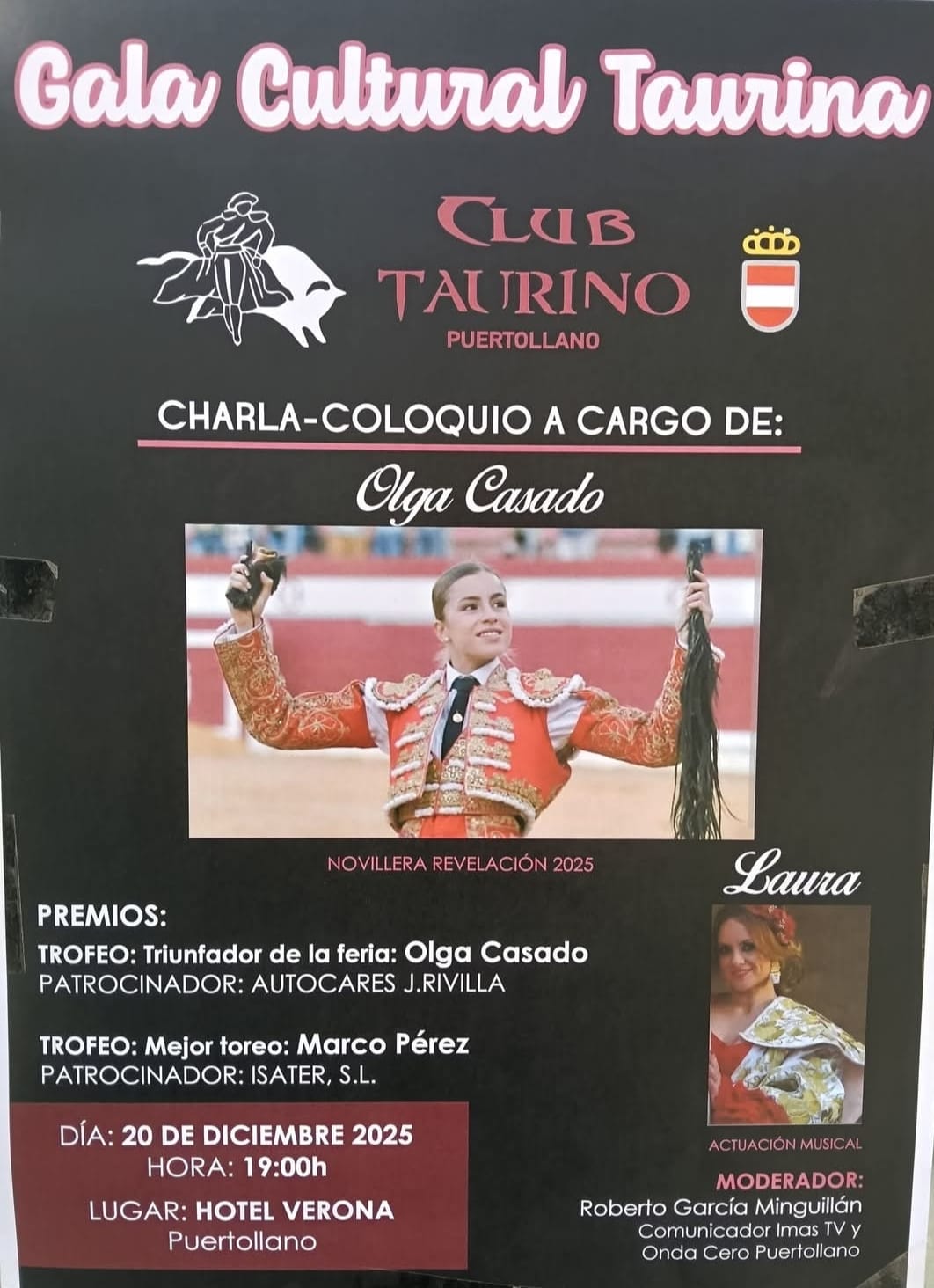 Un evento taurino de primer nivel que ofrece algo más que una entrega de premios, porque las personas asistentes podrán aprender de toros con una charla coloquio a cargo de Olga Casado, novillera revelación 2025; participar y emocionarse en el homenaje al novillero retirado y personaje muy querido en Puertollano, Moisés Corrales «Acho», por su donación al club del primer traje de luces que tuvo acompañado de un traje corto; además de deleitarse con el arte y la gran voz de la cantaora Laura García. Para finalizar degustando un gran ágape compartiendo de forma amena impresiones, recuerdos y anécdotas.