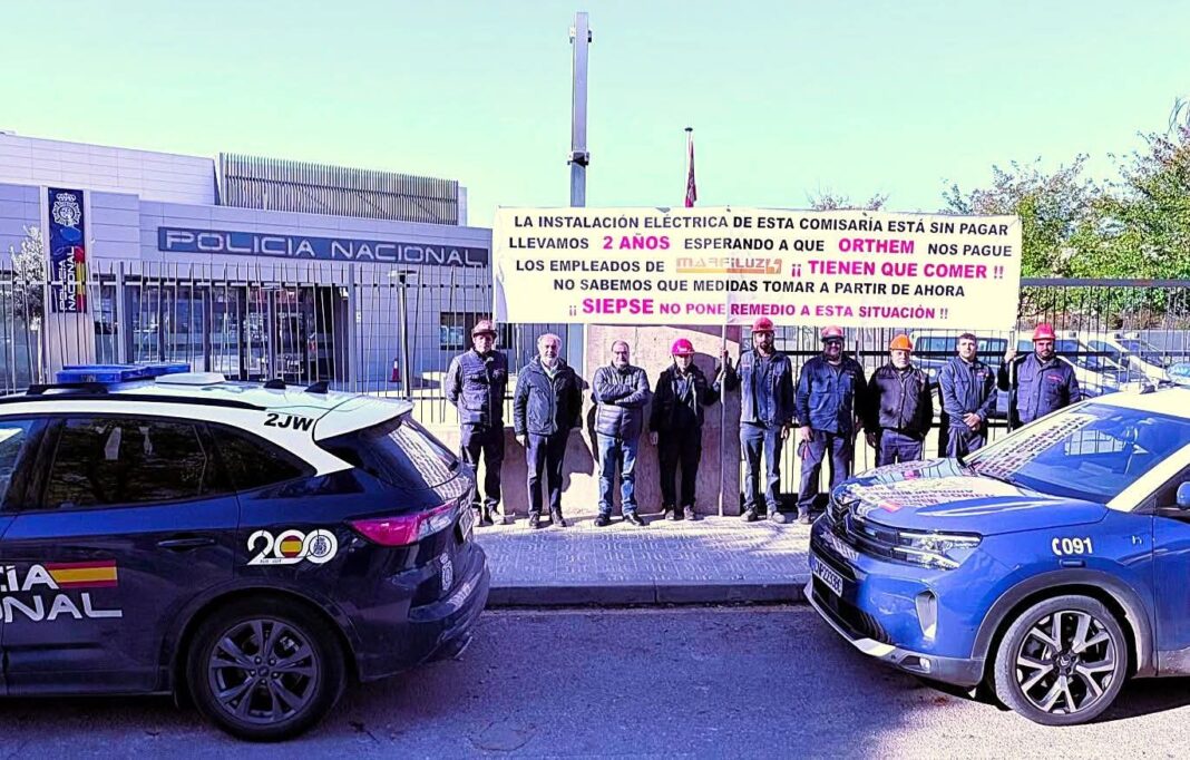 «La instalación eléctrica de esta comisaría está sin pagar. Llevamos dos años esperando a que Orthem nos pague ¡Los empleados de Marfiluz tienen que comer! No sabemos qué medidas tomar a partir de ahora.¡Siepse no pone remedio a esta situación!». Ese es el texto que los trabajadores de la empresa puertollanense Marfiluz han escrito en una pancarta bajo la cual se han fotografiado para reclamar el pago de los trabajos que han realizado en la nueva comisaría de policía de Puertollano, según informa Julián Gómez. Ante su dramática situación han colgado la pancarta en la verja que rodea dichas instalaciones como una medida extrema para dar a conocer su situación e instar a que se solvente con la mayor celeridad posible porque se trata de 300.000 euros de deuda que, después de 28 meses, sigue sin ser saldada, según aseguran desde la empresa Marfiluz.