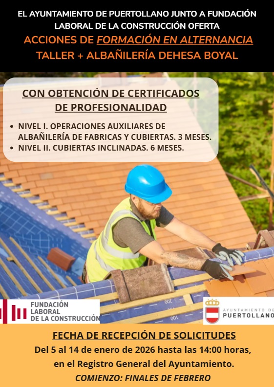 El Ayuntamiento de Puertollano y la Fundación Laboral de la Construcción ha abierto el plazo de presentación de solicitudes de la convocatoria de diez plazas de alumnos trabajadores del programa Taller+ “Albañilería Dehesa Boyal”. Se podrán presentar desempleados de 16 a 29 años hasta el 14 de enero a las 14 horas en la Oficina de Atención al Ciudadano (Casa de Baños) o en sede electrónica.