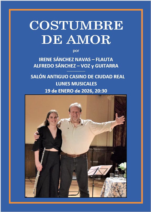El lunes 19 de enero a las 20:30 horas se celebrará en el Antiguo Casino el recital literario-musical “Costumbre de amor”, dentro del ciclo ‘Lunes Musicales’ del Ayuntamiento de Ciudad Real, a cargo del cantautor y poeta Alfredo Sánchez y la flautista Irene Sánchez Navas.