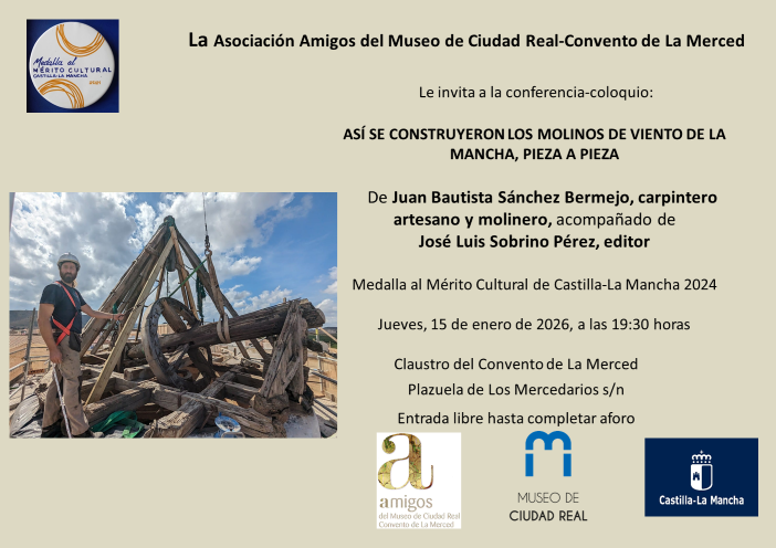 La Asociación Amigos del Museo de Ciudad Real–Convento de La Merced ha organizado una conferencia-coloquio titulada “Así se construyeron los molinos de viento de La Mancha, pieza a pieza”, que tendrá lugar el jueves 15 de enero de 2026, a las 19:30 horas, en el Claustro del Convento de La Merced.