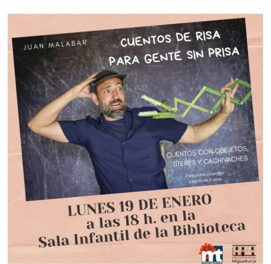 Esta actividad cultural tendrá lugar el próximo lunes 19 de enero, a cargo de Juan Malaba: «Cuentos de risa para gente sin prisa». Actividad que busca el entretenimiento del público con historias emocionantes en un ambiente lúdico y cómico, para mirar el mundo que nos rodea con otros ojos, al margen de la aridez y aspereza de la realidad circundante, y olvidarnos de agobios y prisas con una sonrisa.