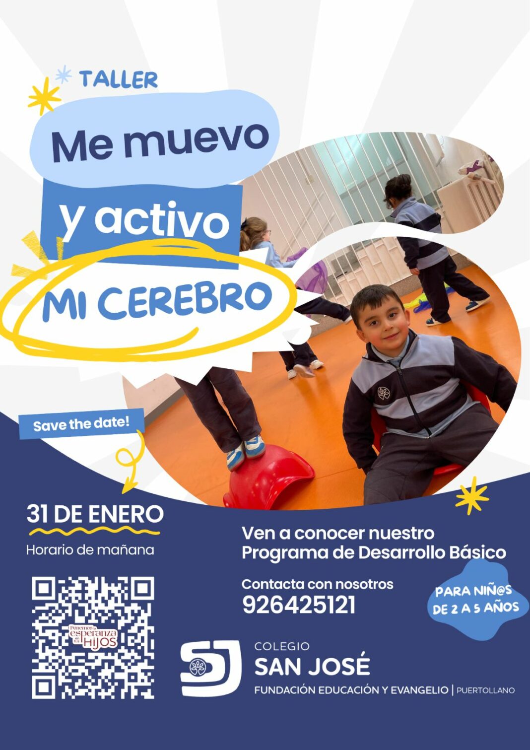 Con el objetivo de maximizar el potencial de los más pequeños en su etapa de mayor plasticidad cerebral, el Colegio San José anuncia la celebración del taller práctico «Me muevo y activo mi cerebro». La actividad, diseñada específicamente para familias con niños y niñas de 2 años, tendrá lugar el próximo sábado 31 de enero.
