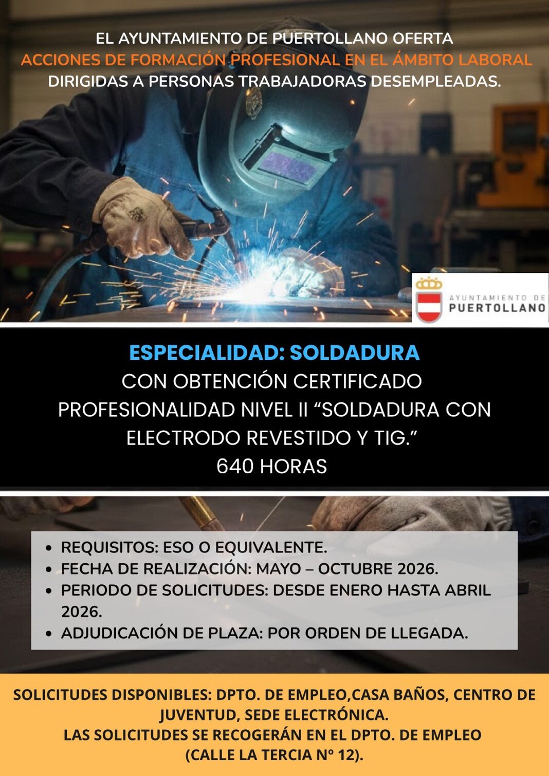 El Ayuntamiento de Puertollano impartirá un curso para obtener el Certificado de Profesionalidad de Nivel II “Soldadura con Electrodo Revestido y TIG”, que tendrá una duración 640 horas de mayo a octubre.