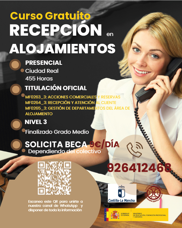 El sector turístico ofrece excelentes perspectivas de empleo y particularmente para la contratación de Recepcionistas. Nuestro centro de formación acreditado por la JCCM te ofrece un curso muy interesante y totalmente gratuito, que comienza la próxima semana en Ciudad Real, en el Hotel Santa Cecilia, en horario de 9.00 a 14.00 . La certificación es oficial, y convalidable con la formación profesional.