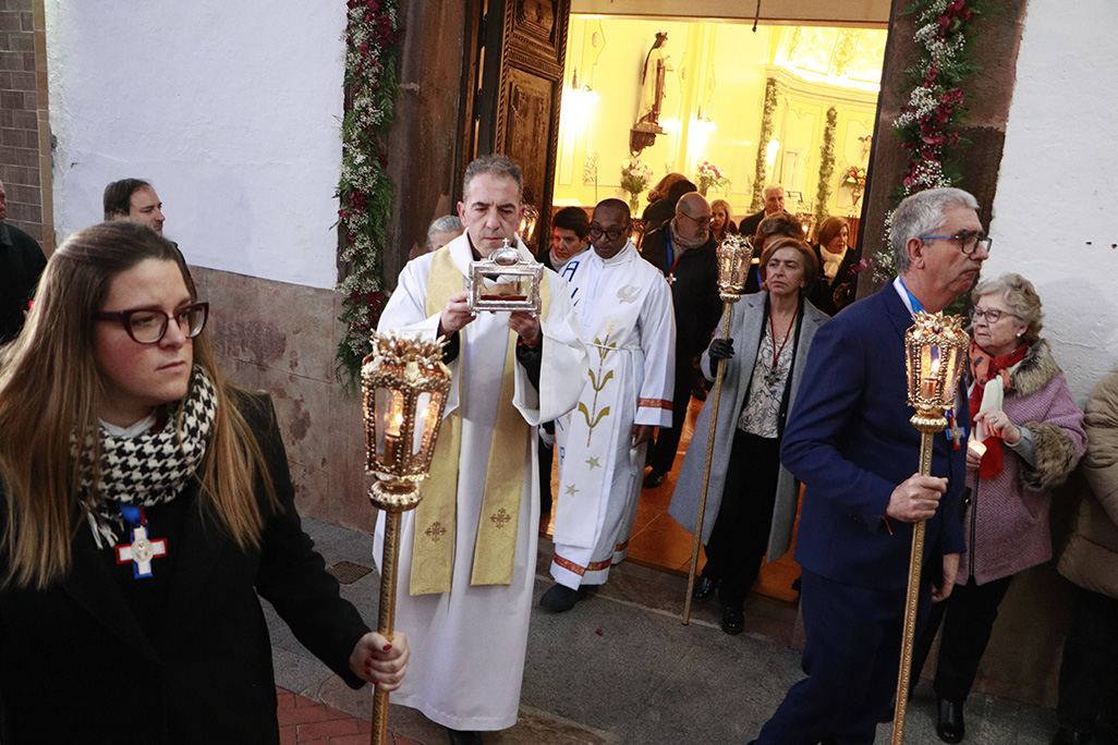 Durante el itinerario, la pequeña urna con los restos mandibulares del santo natal, fue llevada por turno por los sacerdotes de la Parroquia, Juan Carlos Torres y Eric Nzamwita, hasta el templo de la Virgen del Carmen donde, al mediodía, ya hubo función solemne.