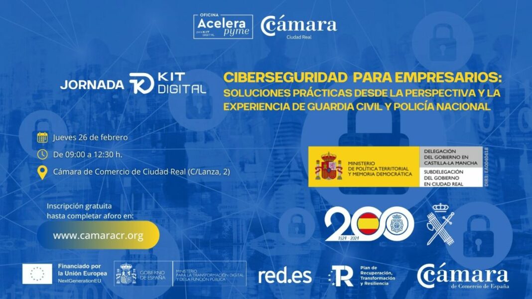 La Oficina Acelera Pyme de la Cámara de Comercio de Ciudad Real, junto con la Subdelegación del Gobierno, la Guardia Civil y la Policía Nacional, celebra el próximo 26 de febrero una jornada presencial sobre ciberseguridad dirigida especialmente a empresarios, autónomos y profesionales interesados en fortalecer la protección digital de sus negocios.
