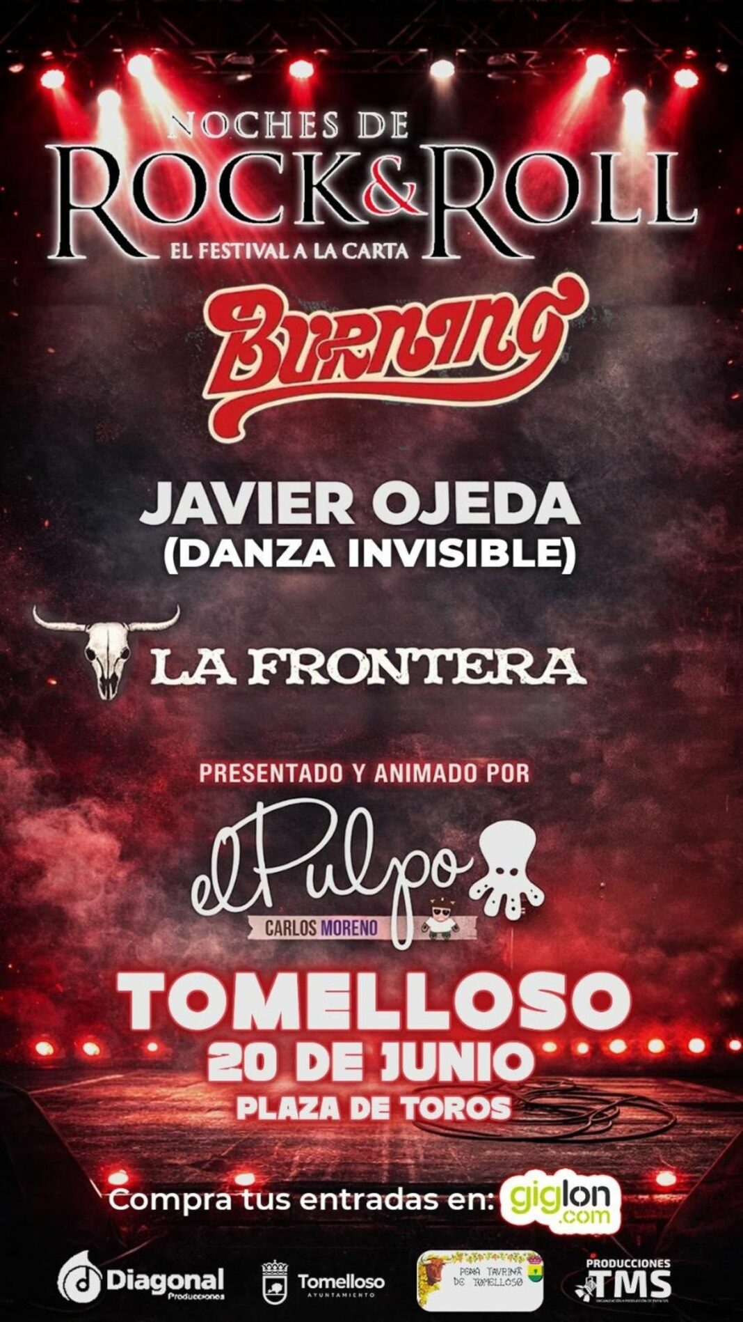 La Plaza de Toros de Tomelloso acogerá el 20 de junio el festival ‘Noches de Rock & Roll’, que incluye las actuaciones de Burning, La Frontera y Javier Ojeda. Este jueves han salido a la venta 300 entradas promocionales al precio de 25 euros, que se pueden adquirir en www.giglon.com