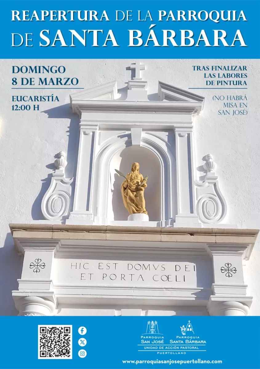 La bella iglesia de Santa Bárbara, en la barriada de El Poblado de Puertollano reabrirá este domingo tras las obras de restauración de pintura exterior e interior iniciadas en noviembre y el cambio de iluminación y cableado. A falta de una tercera fase en la que se quiere cambiar el suelo, muy deteriorado, el templo reabrirá este domingo con la celebración de la Eucaristía a las 12.00 horas. Ese día no habrá misa en San José.