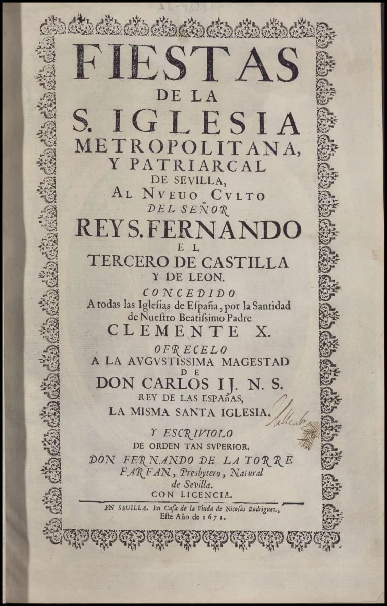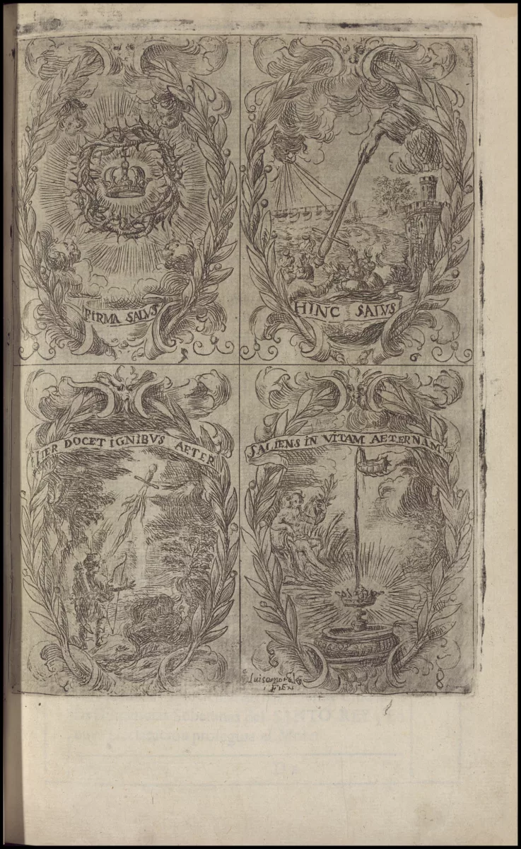 Foto 5: Mujer ilustradora. Emblemas, estampa al aguafuerte de Luisa Morales que ilustra el libro Fiestas de la S. Iglesia… de Sevilla al nuevo culto del … rey S. Fernando el tercero de Castilla y de León, impreso en Sevilla por la viuda de Nicolàs Rodríguez en 1671.