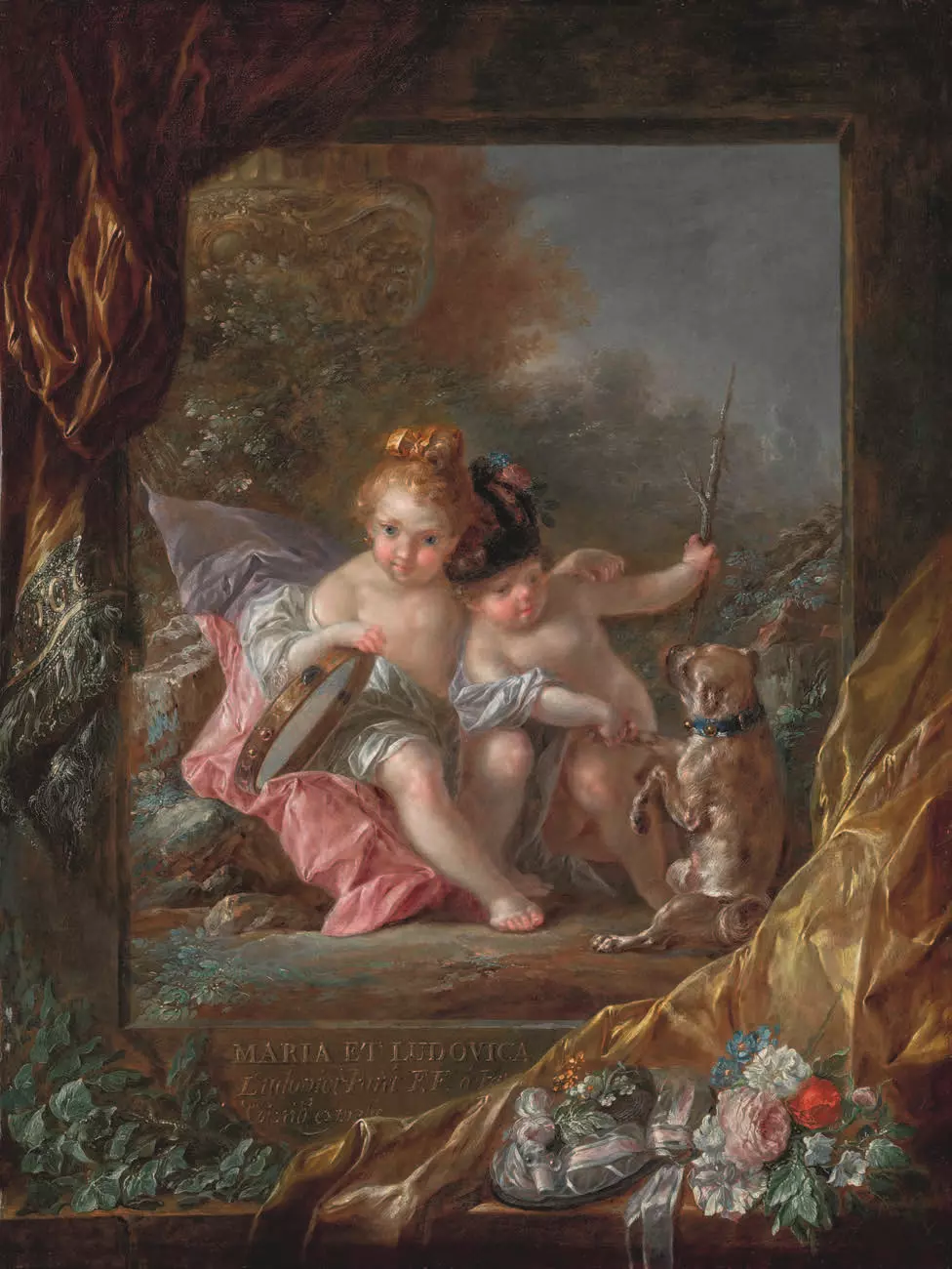Las protagonistas son María y Luisa, hijas del pintor, de tres y dos años respectivamente. Paret las representa como pequeñas ninfas en un paisaje natural: María sostiene una pandereta y abraza a su hermana, mientras Luisa juega con un perrillo y luce una chichonera. La escena, en plena naturaleza, conecta con las ideas educativas de Jean‑Jacques Rousseau, influyentes en el ambiente ilustrado que el artista conocía bien.