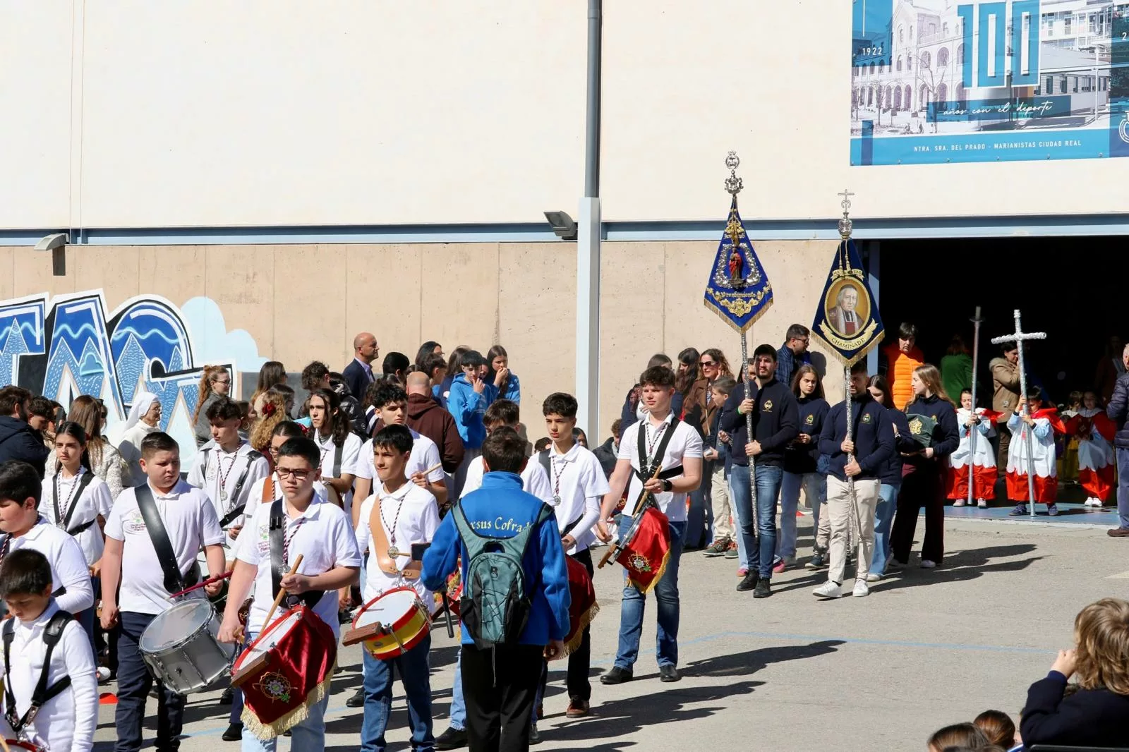 La salida, que tuvo lugar a las 11:00 h desde el pabellón polideportivo, recorrió en primer lugar el interior del centro, dejando momentos de gran emoción, como el paso del cortejo acompañado por las voces del coro colegial. Posteriormente, la procesión se abrió a las calles en torno a las 11:15 h, donde familias, vecinos y numerosos asistentes pudieron acompañar este entrañable acto.