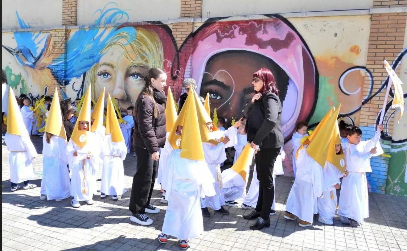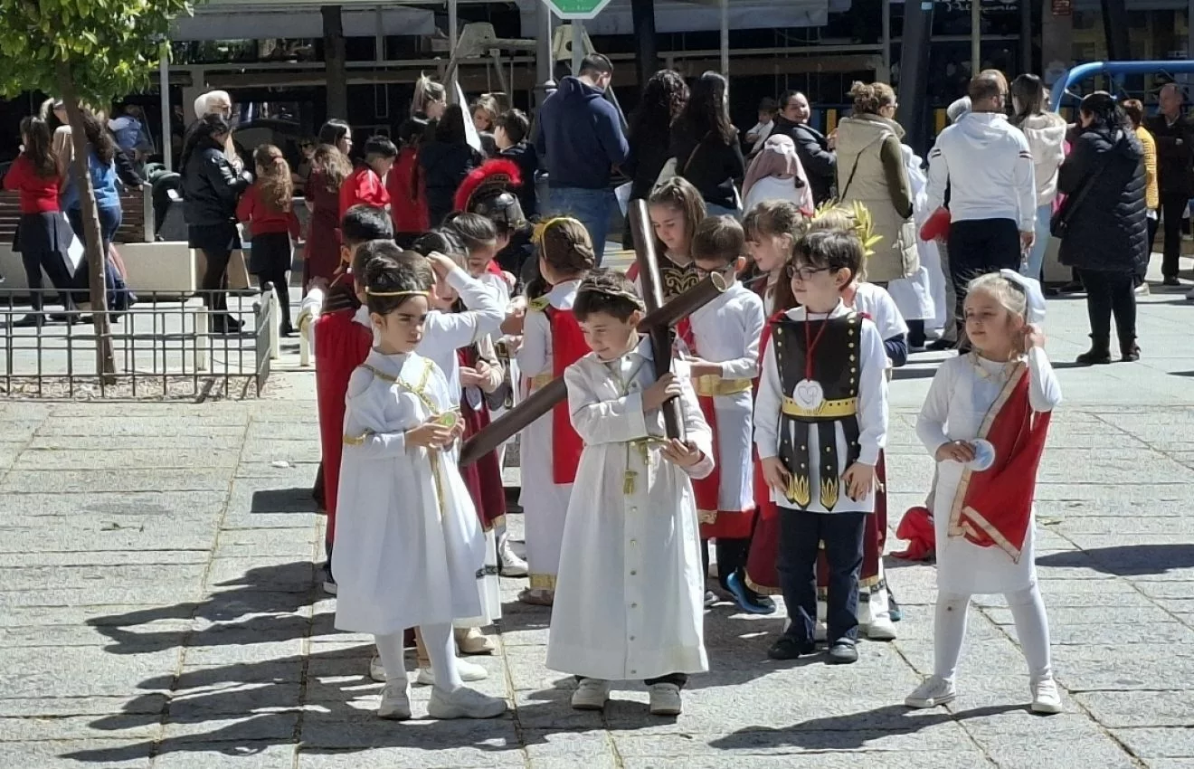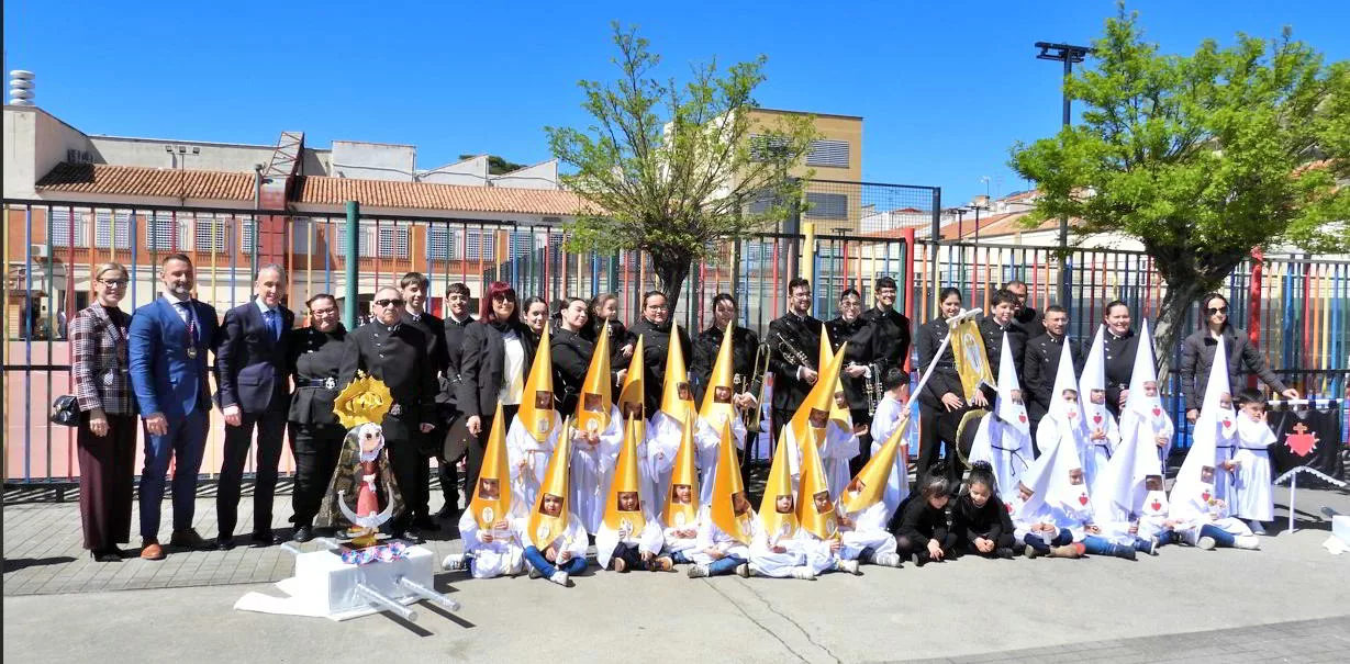 El alumnado de infantil y primaria colegio Salesiano han participado en una procesión por las calles del entorno del centro educativo, que han escenificado las diversas cofradías de la ciudad en una comitiva a la que no han faltado ninguno de los ingredientes de la Semana Santa, desde madrinas, dolorosa en andas, la música de la Agrupación “San Miguel Arcángel” y hasta un alcalde y autoridades locales y militares presidiendo la actividad.