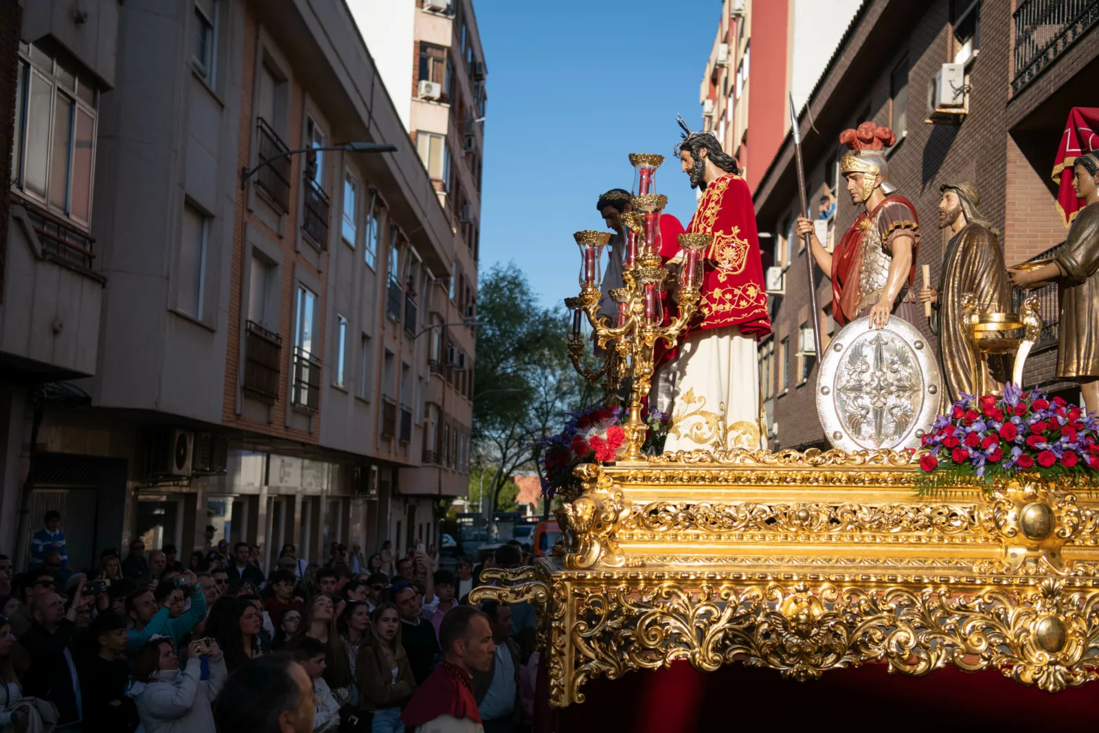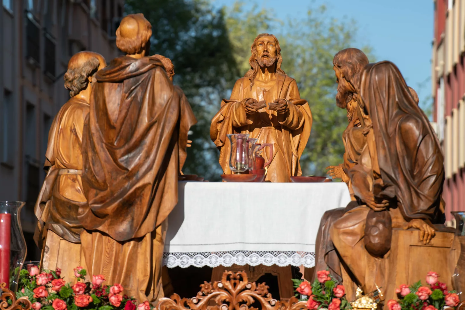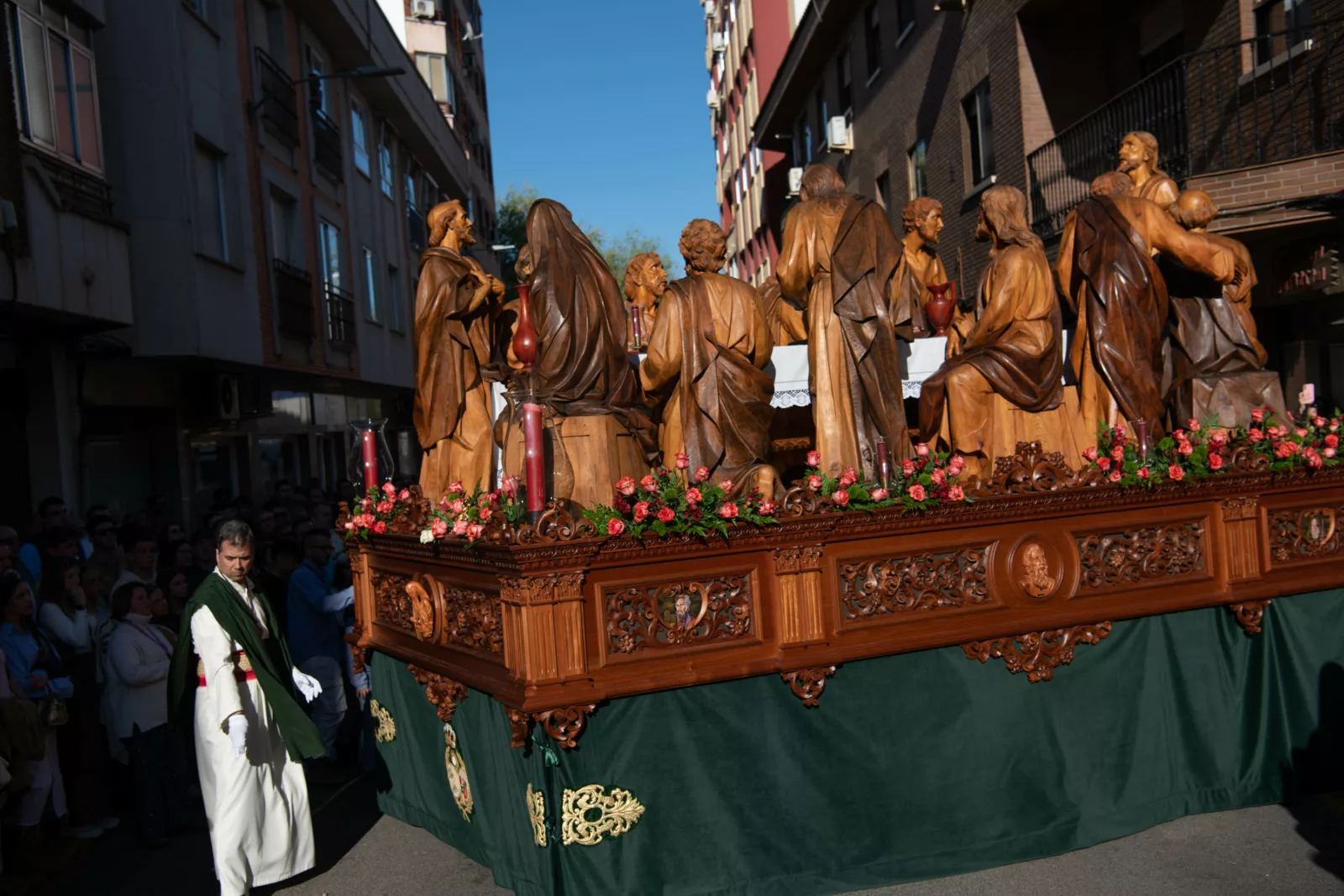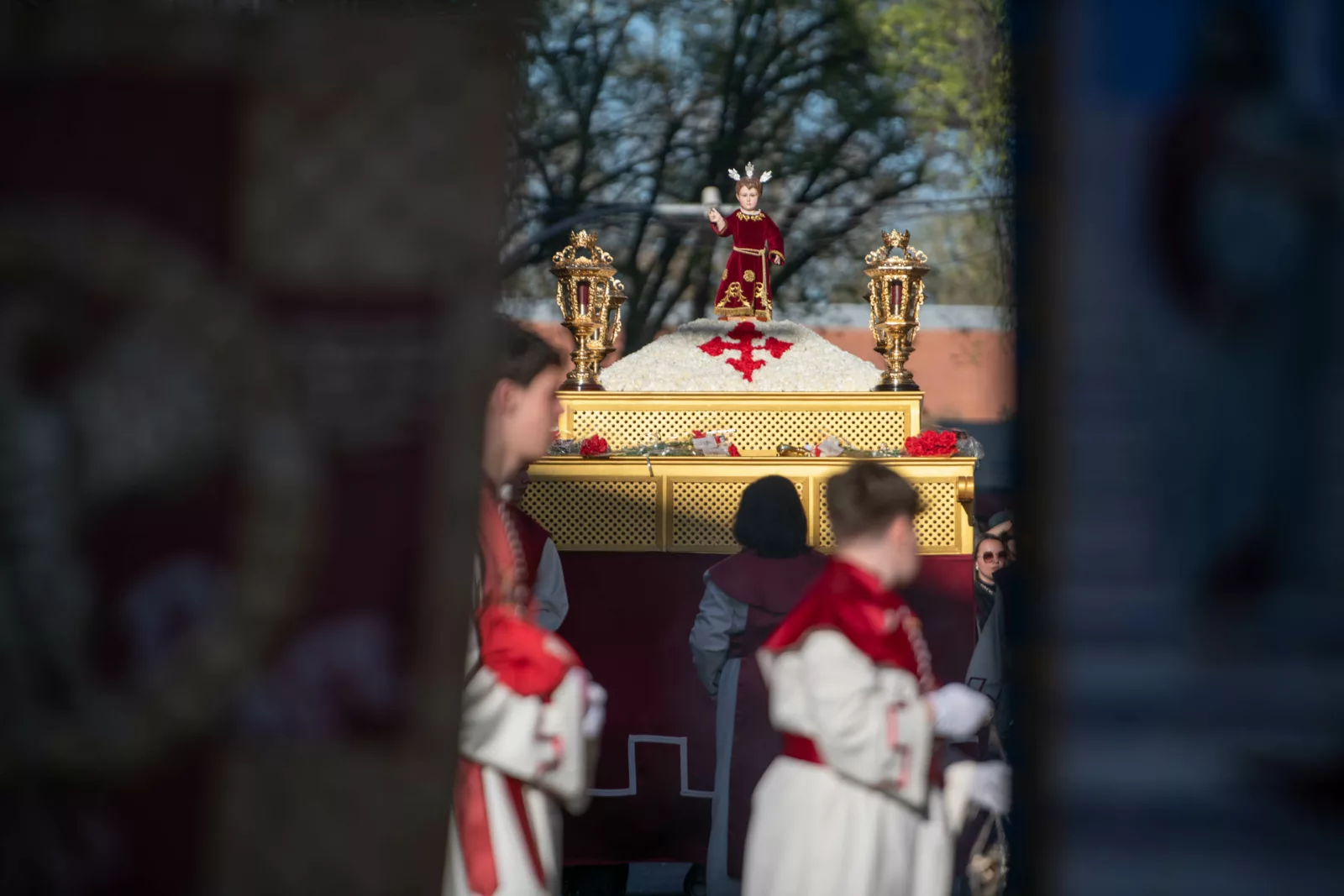 Exorno floral: Centros de rosas rojas (Misterio). Claveles blancos y rojos formando la Cruz de Santiago (Niño).