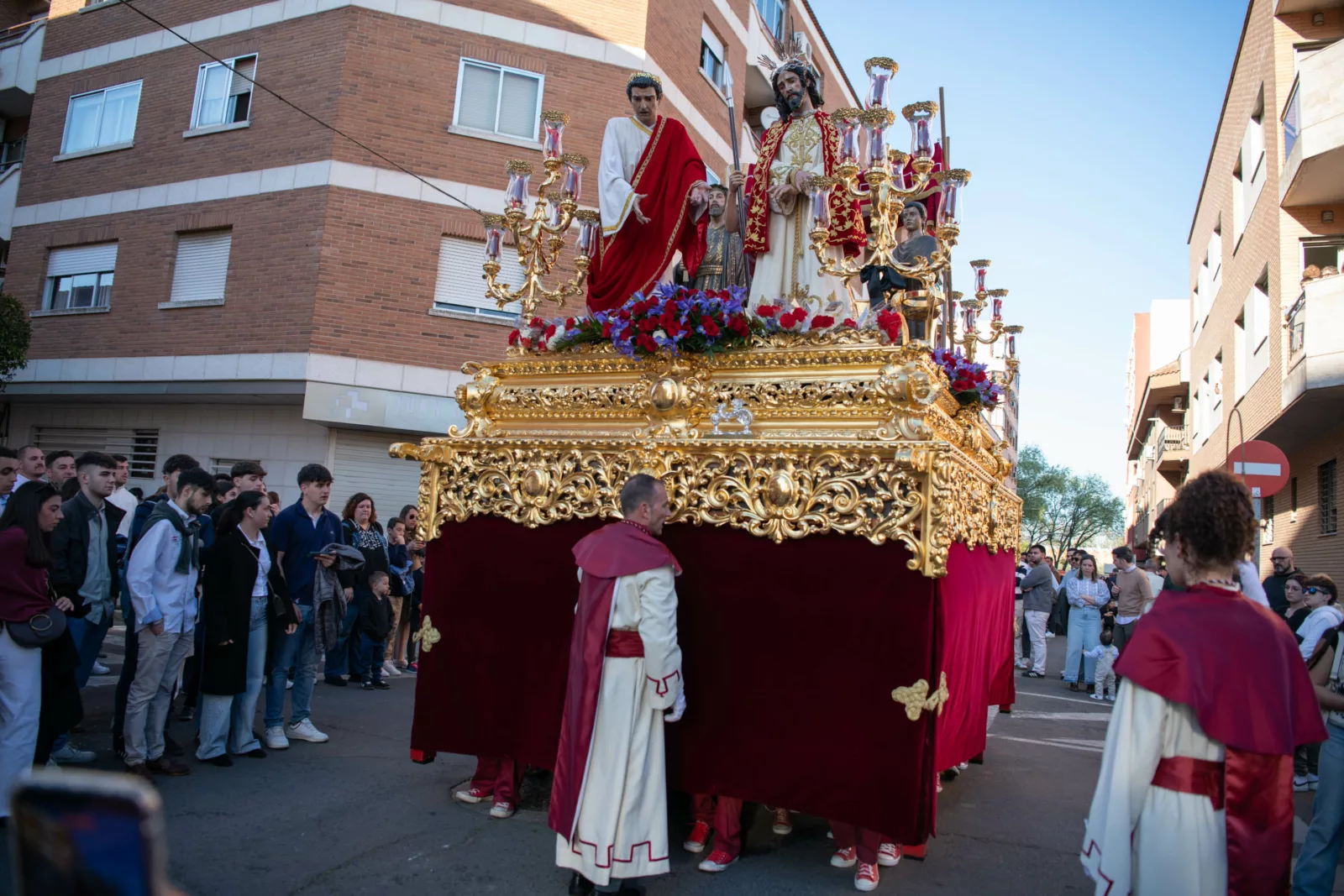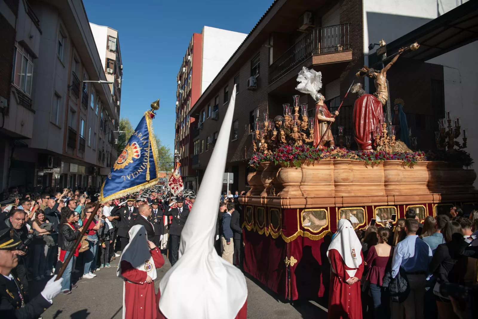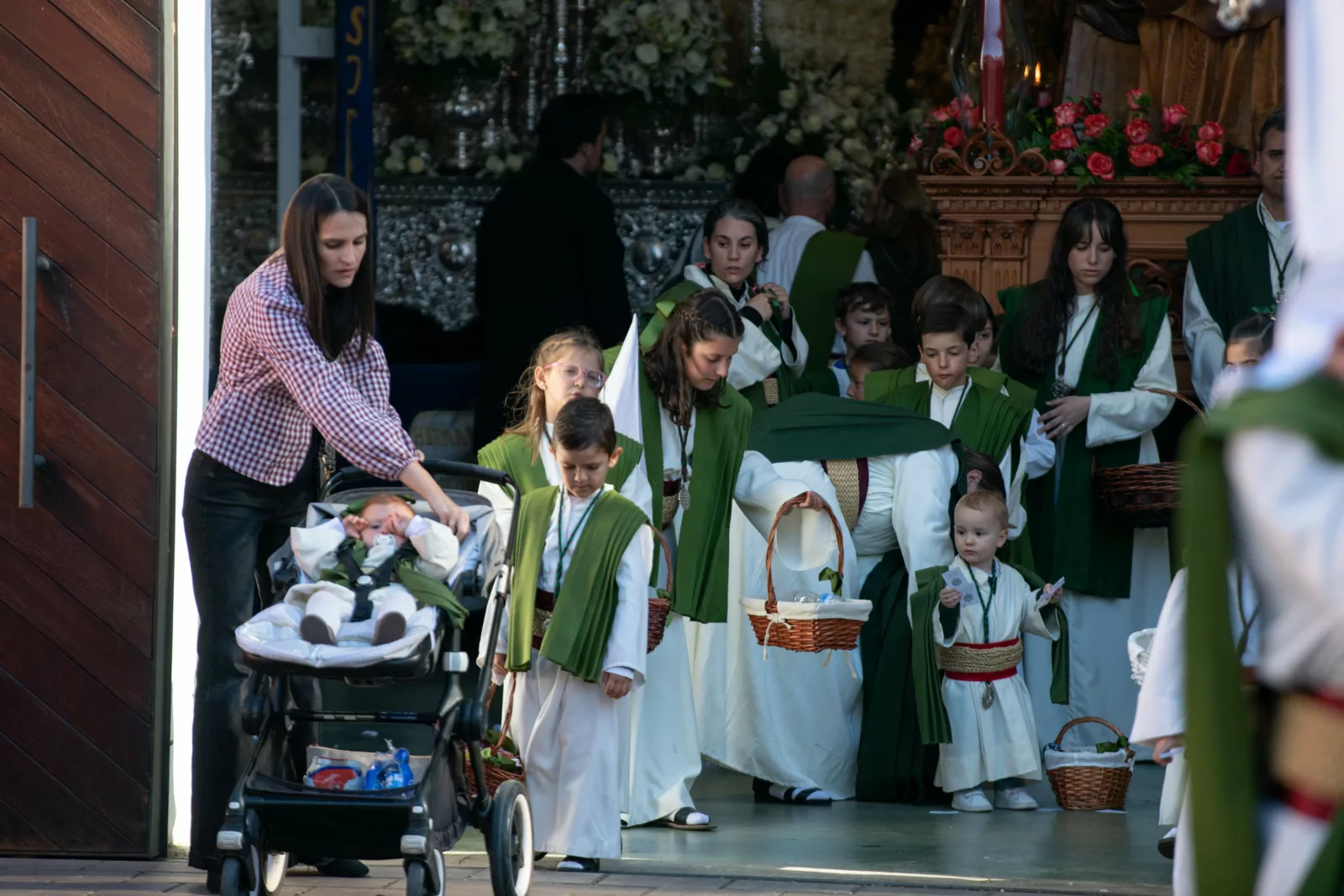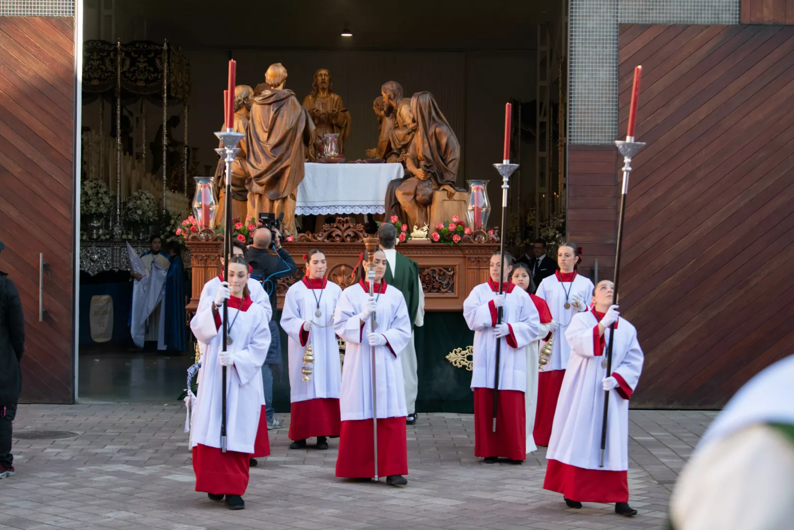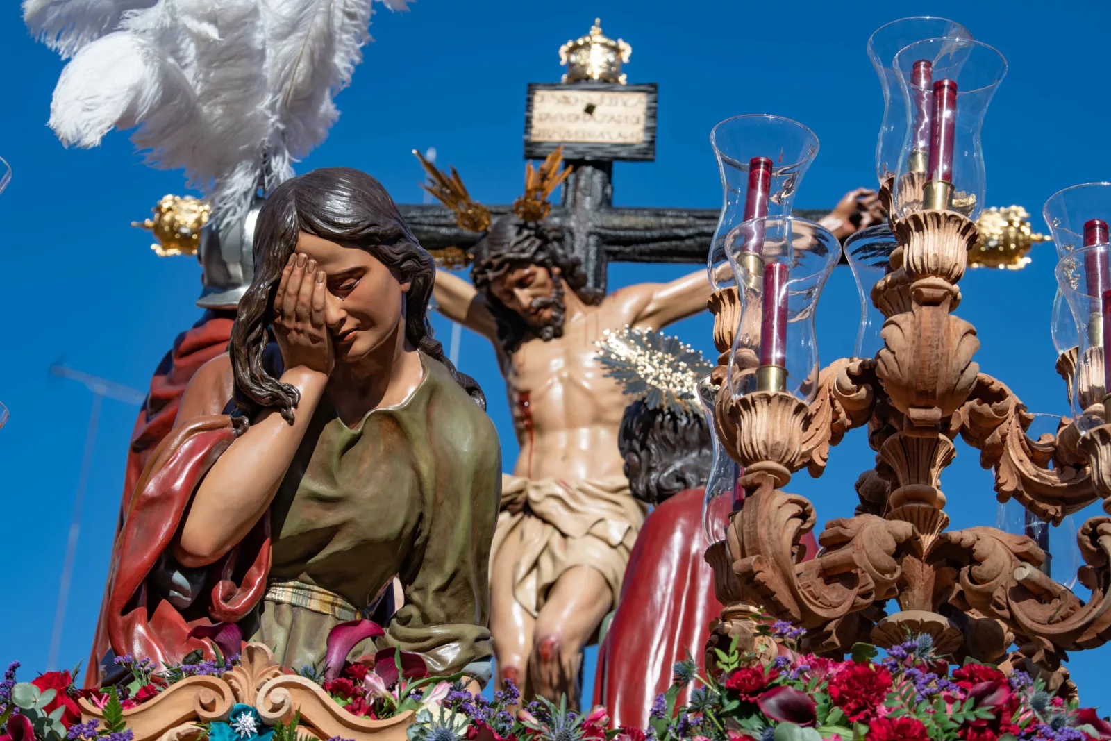 Exorno floral: Centros de rosas rojas (Misterio). Claveles blancos y rojos formando la Cruz de Santiago (Niño).