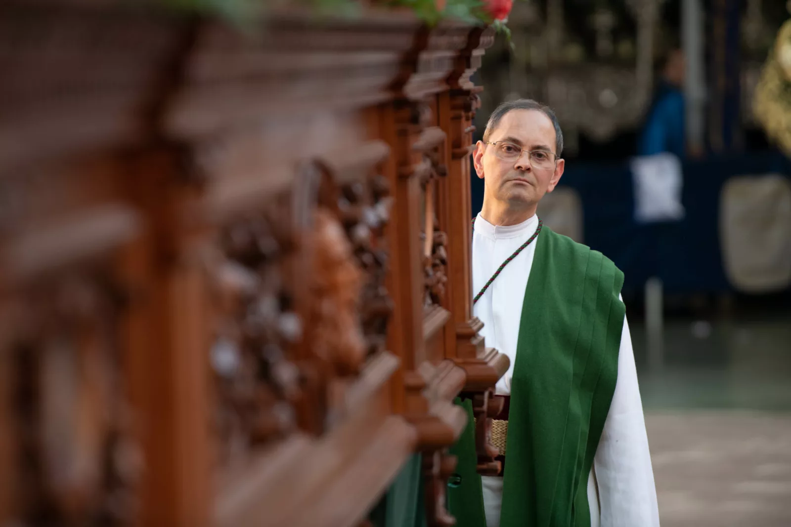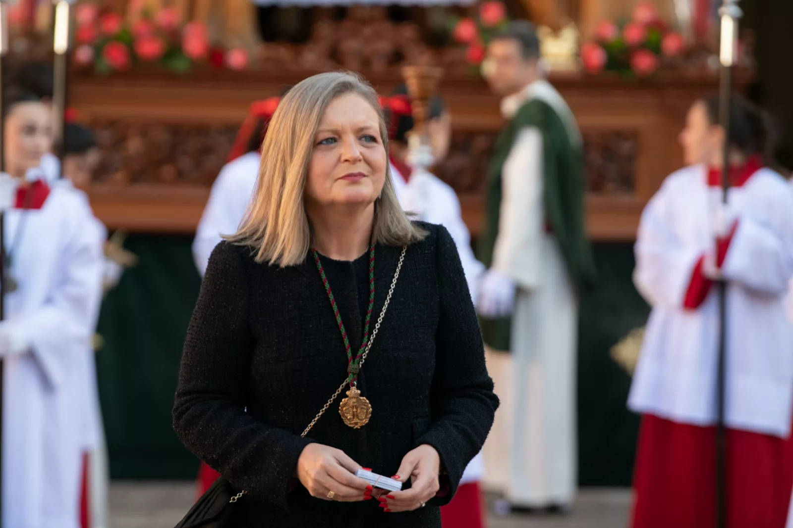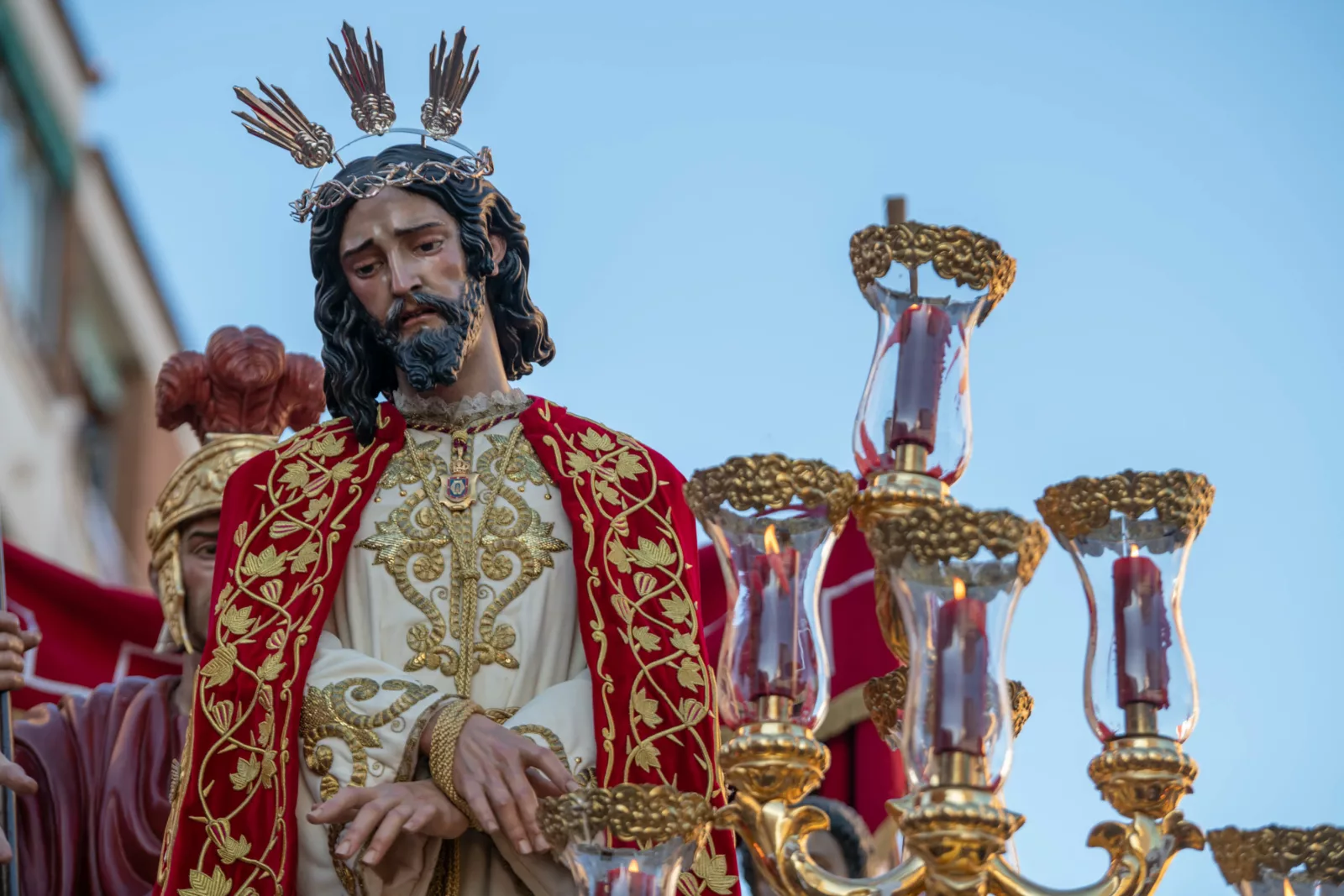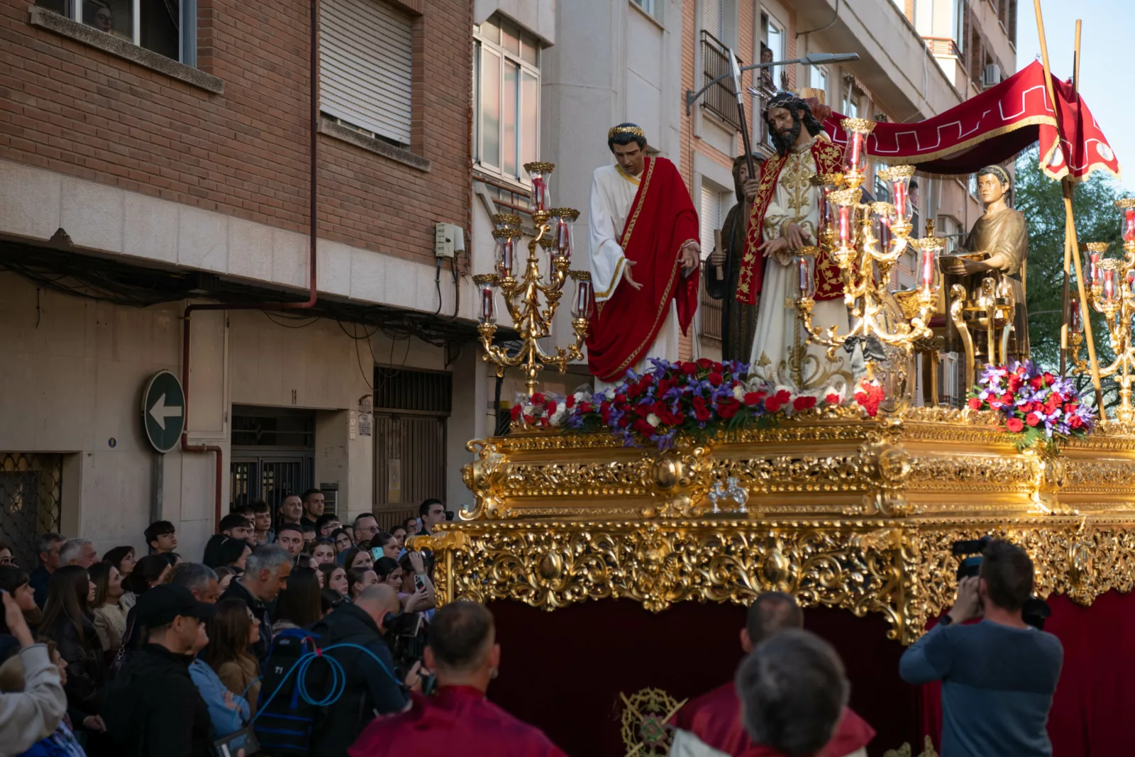 Exorno floral: Centros de rosas rojas (Misterio). Claveles blancos y rojos formando la Cruz de Santiago (Niño).