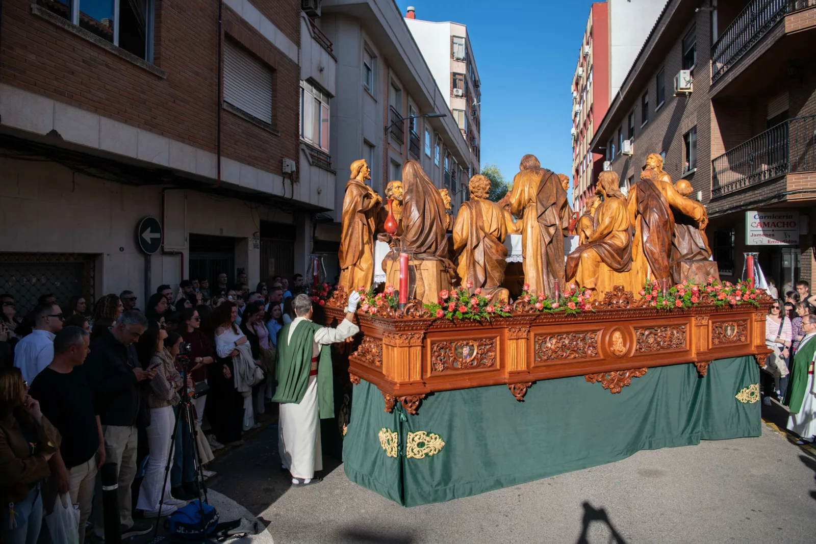 En el palio cuadrilla masculina de 35 costaleros.Acompañamiento musical: En el misterio banda de CCyTT Solera Musical, Ciudad Real. En el Palio, Banda Sinfónica Municipal de música de Pozoblanco, Córdoba.Exorno floral: En el misterio predomina el color rojo y en el palio el color blanco.(Ilustración del paso de la Santa Cena)Lugar de salida: Guardias ases