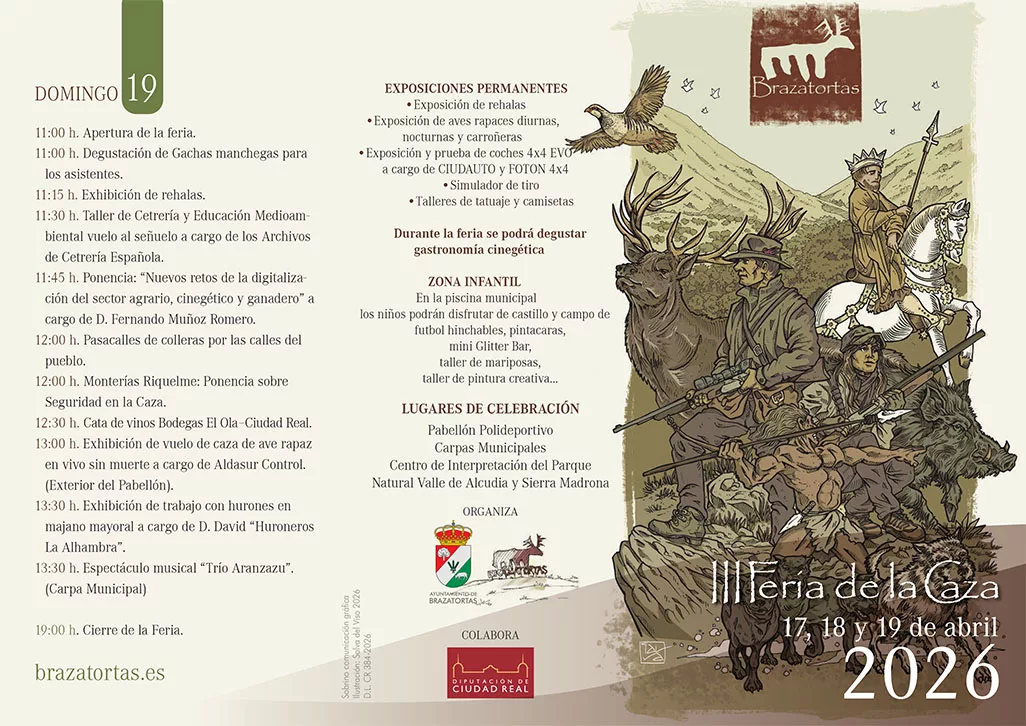 El Ayuntamiento de Brazatortas ha previsto una gran programación para la tercera edición de su Feria de la Caza, evento que transcurrirá del viernes 17 al domingo 19 de abril con numerosas propuestas, entre rehalas, exhibiciones de vehículos y maquinaria, gastronomía y 45 expositores de guarnicionería, taxidermia, ropa técnica, gestión cinegética, sobre todo.