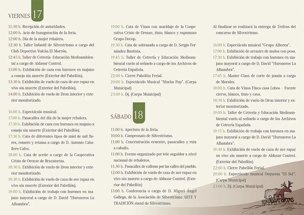 Por la tarde habrá también demostraciones técnicas que incluyen el trabajo de hurones en majano a cargo de Huroneros ‘La Alhambra’ y el vuelo de aves rapaces al señuelo, así como cata de miel de mil flores, romero y retama, de aceite de oliva de la Cooperativa Cristo de Orense, de vinos maridados del Grupo Dcoop y de sobrasada. Y se podrá asistir al recital musical del grupo Mucho Pop.