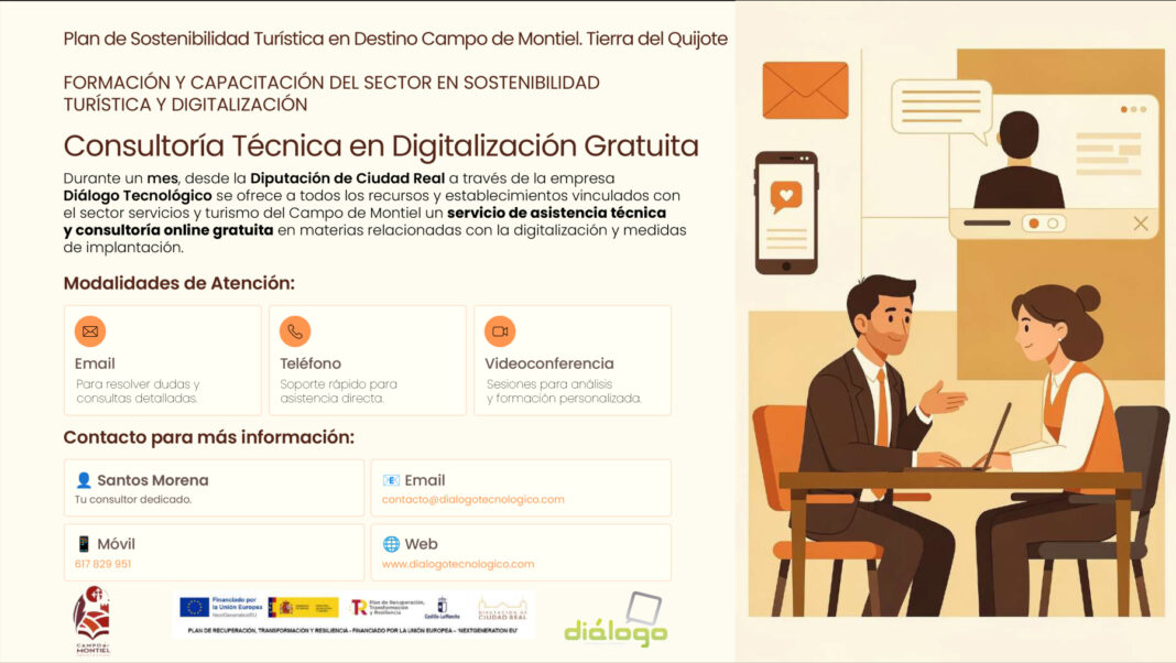 Durante este periodo de consultoría, la Diputación de Ciudad Real, a través del Plan de Sostenibilidad Turística del Campo de Montiel-Tierra del Quijote, pone a disposición del sector un servicio de atención directa durante un mes, con el fin de ofrecer asesoramiento individualizado en la implantación de soluciones digitales eficientes. Las empresas interesadas podrán acceder a este servicio a través del correo electrónico contacto@dialogotecnologico.com, del número de teléfono 617 829 951 o a través de la web www.dialogotecnologico.com .