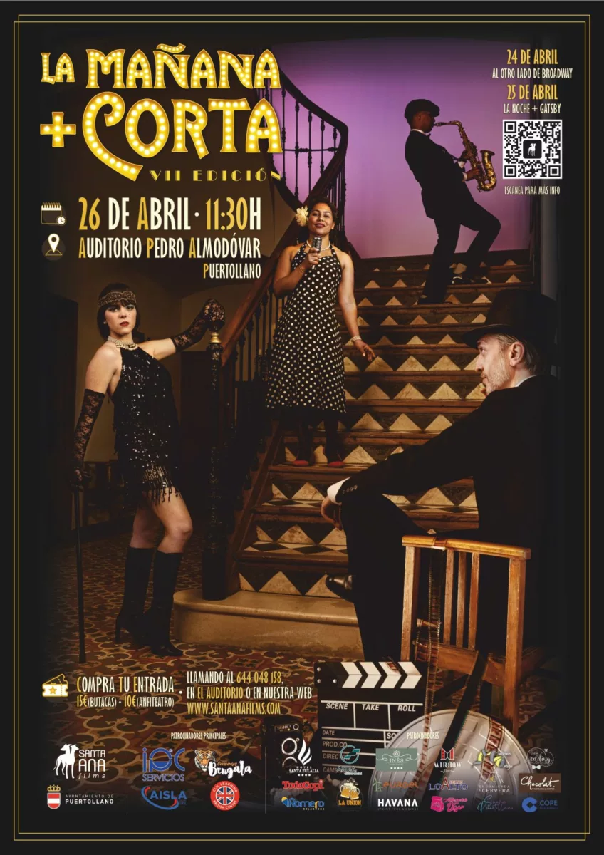 Por último, en la mañana del Domingo, día 26, a las 11.30 horas, tendrá lugar la esperada VII Edición de La mañana más corta en el Auditorio Municipal, un evento para el que ya se han vendido más de 600 entradas y en el que, además de proyectarse un total de cinco cortometrajes, los espectadores podrán disfrutar de dos espléndidos homenajes: uno, al cine musical de Broadway con múltiples actuaciones en directo; el otro, al programa especializado en cine que emite el Canal 24 horas de RTVE, Secuencias en 24 horas, al contar la productora local con la presencia de su director, el reputado periodista Moisés Rodríguez, a quien harán una entrevista a pie de escenario.