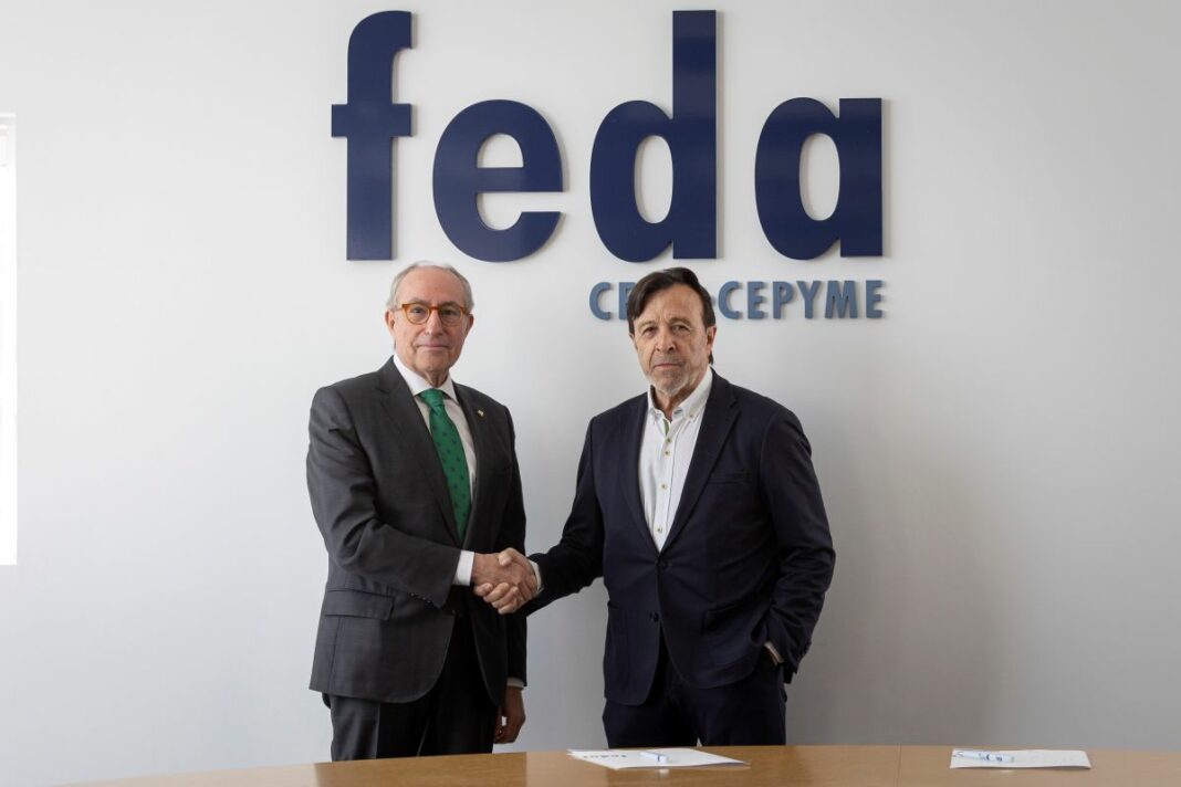 El presidente de Globalcaja, Mariano León Ejido, y el presidente de la Confederación, Artemio Pérez Alfaro, han renovado el compromiso de colaboración entre Globalcaja y FEDA, apostando por acciones de fortalecimiento y crecimiento del tejido empresarial