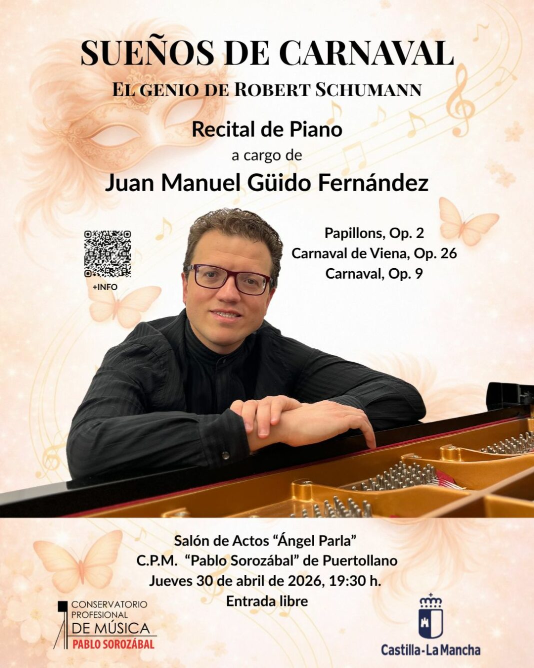 El próximo jueves, 30 de abril, tendrá lugar en el Conservatorio Profesional de Música Pablo Sorozábal de Puertollano un recital de piano muy especial a cargo de Juan Manuel Güido Fernández. Dicho recital, cuyo título es “Sueños de Carnaval”, dará comienzo a las 19:30 horas en el salón de actos “Ángel Parla” del centro, y es de entrada libre hasta completar aforo.