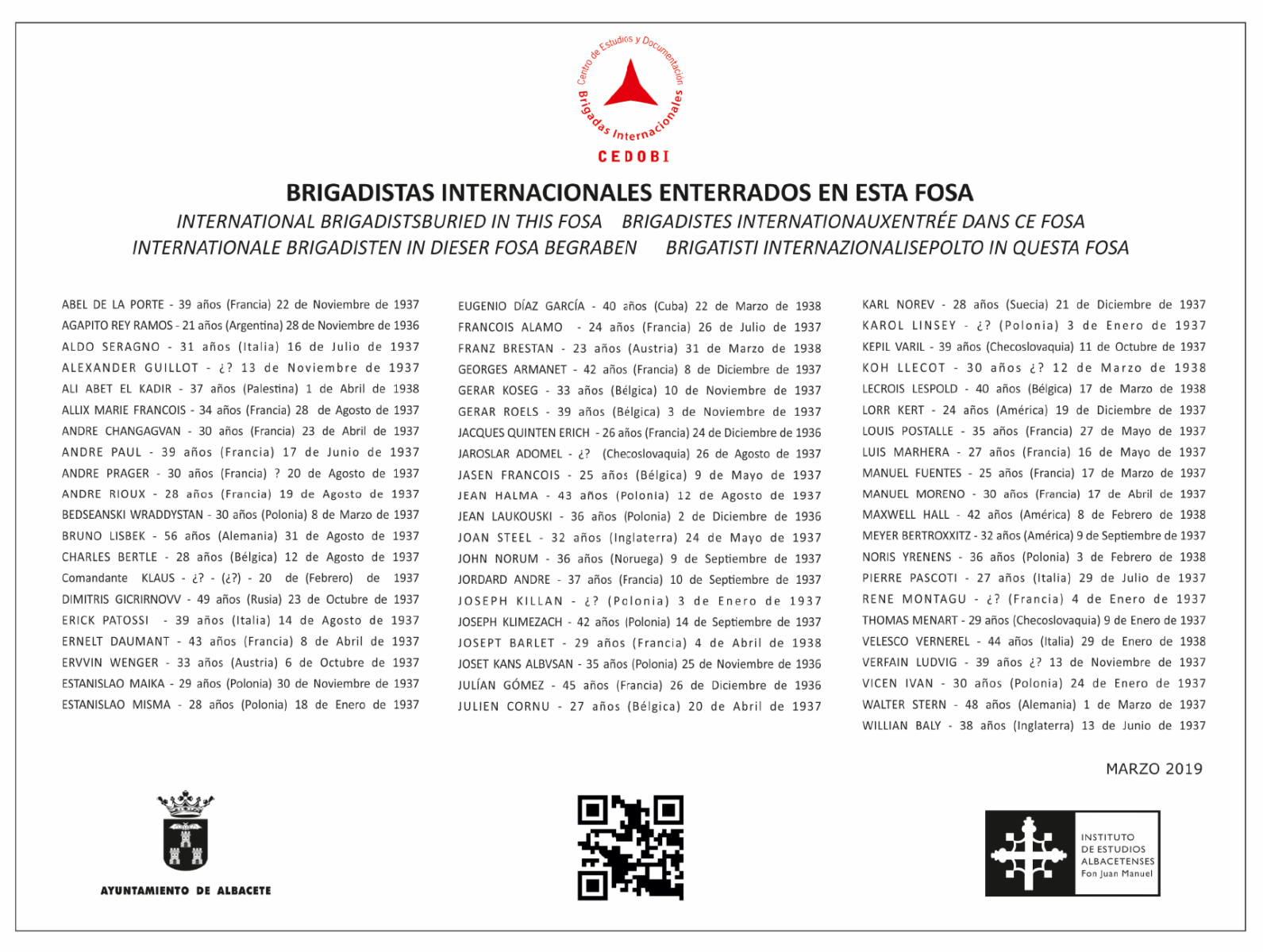 Desde 2019 hasta 2025 pueden destacarse algunos hitos importantes en la vida del CEDOBI. Por ejemplo, en 2018 el Instituto de Estudios Albacetenses inicia un expediente en el Ayuntamiento de Albacete con la solicitud de instalación de una placa en el cementerio municipal con los nombres de los brigadistas allí enterrados. El 25 de octubre de ese año la concejala de Barrios, Pedanías y Cementerios, María Llanos Navarro González, autoriza su instalación, que se coloca el 14 de marzo de 2019. Se recuerda así a los 61 brigadistas internacionales enterrados en la fosa común y aparecen en ella nombres, nacionalidad, edad y fecha de fallecimiento. Los voluntarios enterrados proceden de quince nacionalidades diferentes, con predominio de polaca y francesa, pero también hay un palestino, un cubano o un argentino, además de alemanes, americanos, belgas, checoslovacos, ingleses o italianos.