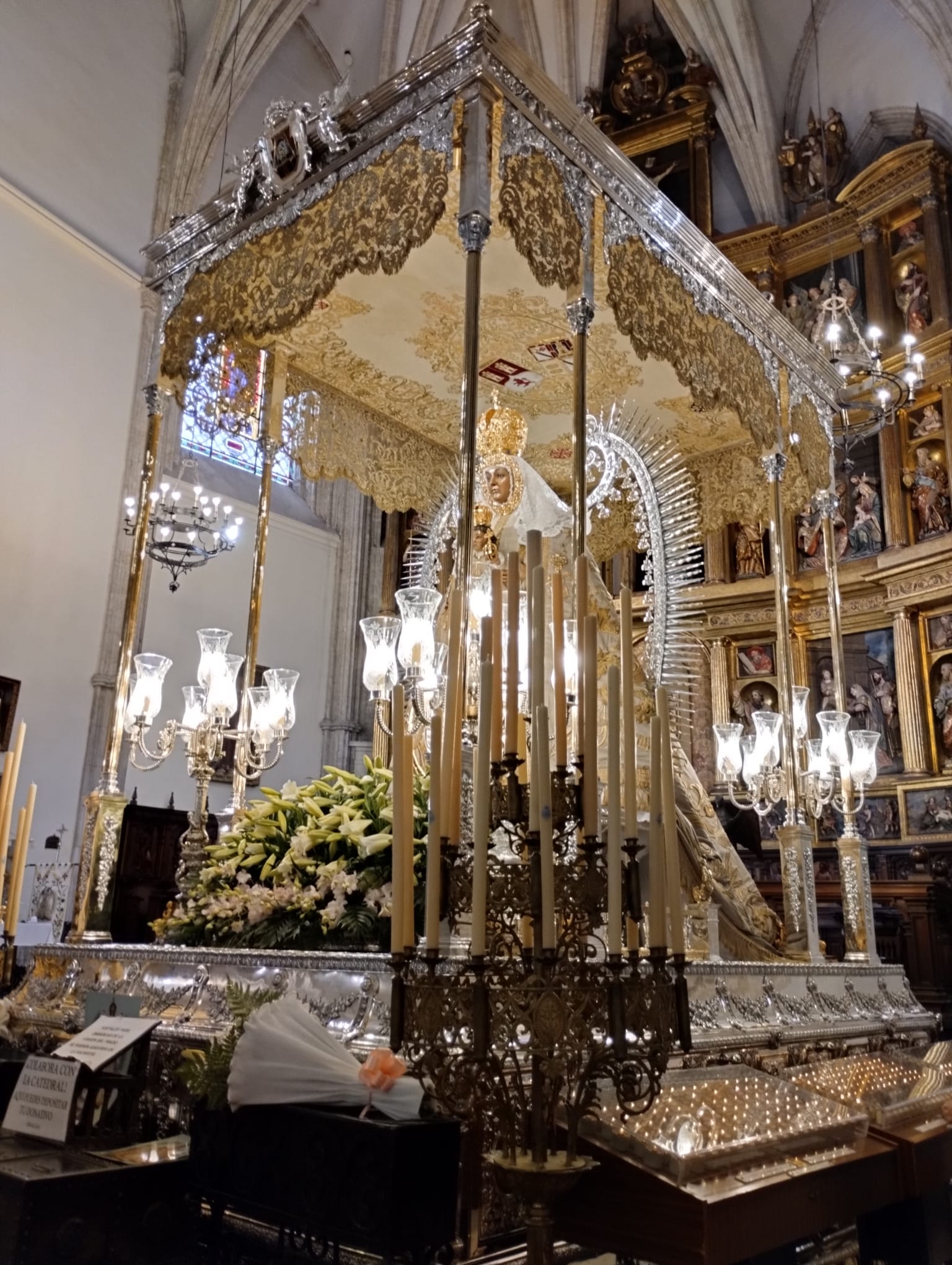Eduardo Muñoz Martínez.- Partiendo de la base, según me cuenta el buen amigo y mejor historiador Emilio Martín Aguirre, de que «siempre se ha hecho así»; o de que el Retablo Presbiteral de nuestra Santa Iglesia Catedral Basílica, trazado por Andrés de La Concha, tallado y ensamblado por Giraldo de Merlo, y pintado y estofado por Juan de Asten y los hermanos Cristóbal y Pedro Ruiz Elvira, entre 1612 y 1616, en cuya segunda «calle» se abre el camarín, -como decimos, del siglo XVII-, de estilo barroco, bien podemos aventurarnos a hablar de cuatrocientas vísperas de San Lorenzo, o tal vez más, en las que a la caída del sol, según la coplilla, aunque en desacuerdo con la realidad, es bajada la Patrona al Altar Mayor, al borde del presbiterio.